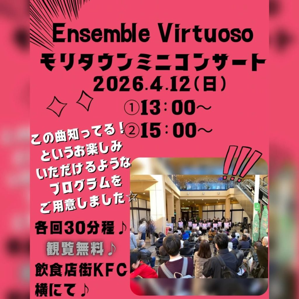 JR青梅線・昭島駅北口にある大型商業施設モリタウンさん内にて、アンサンブルによるミニコンサートを行います☆